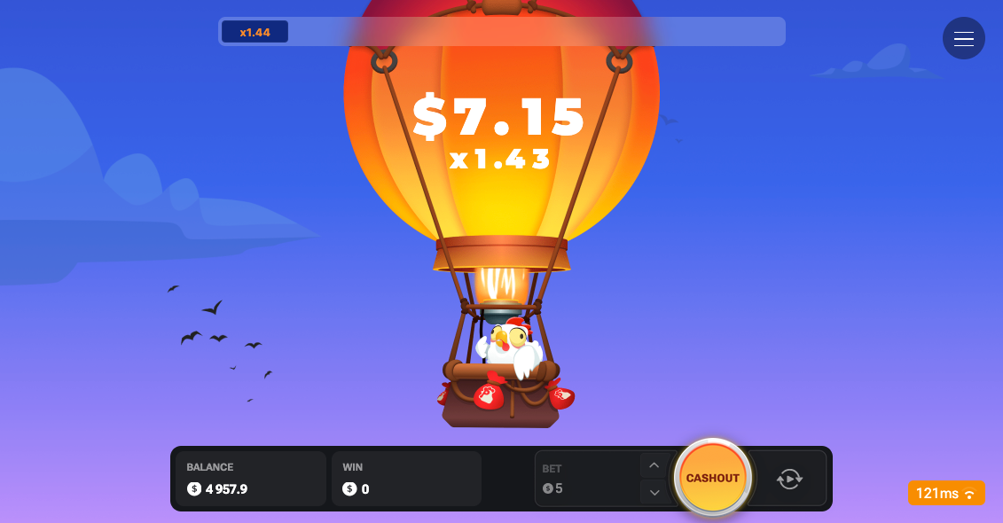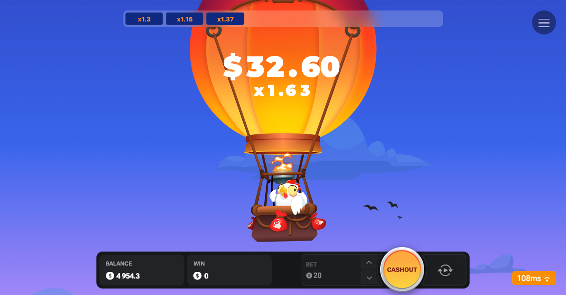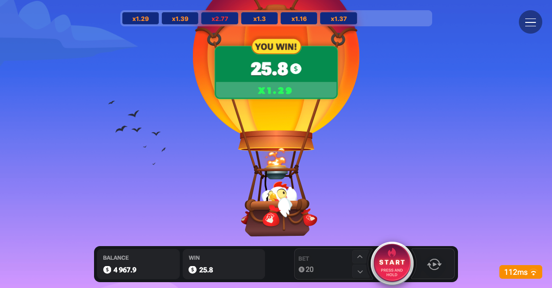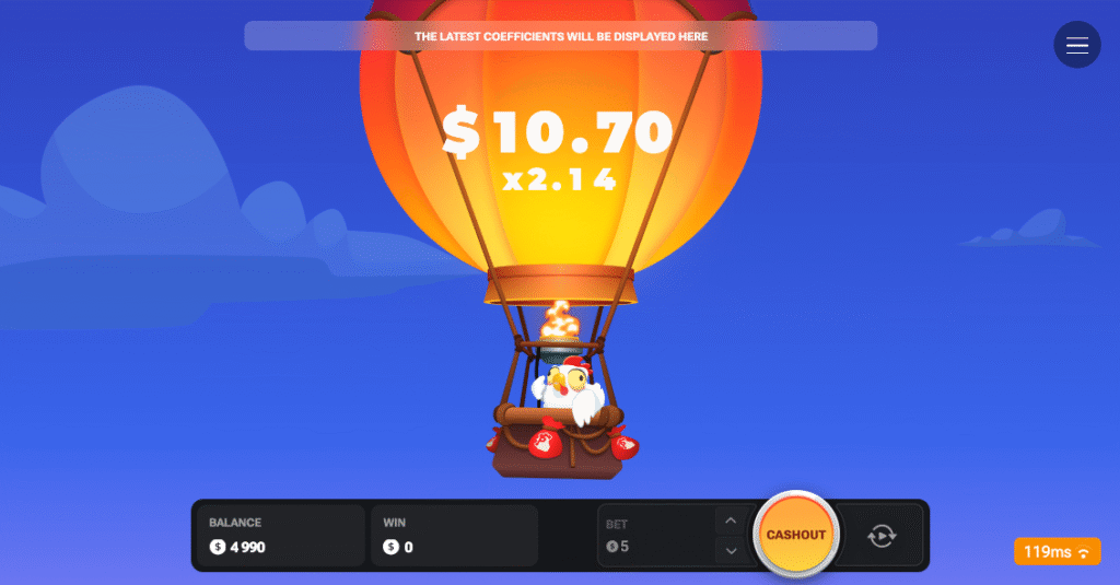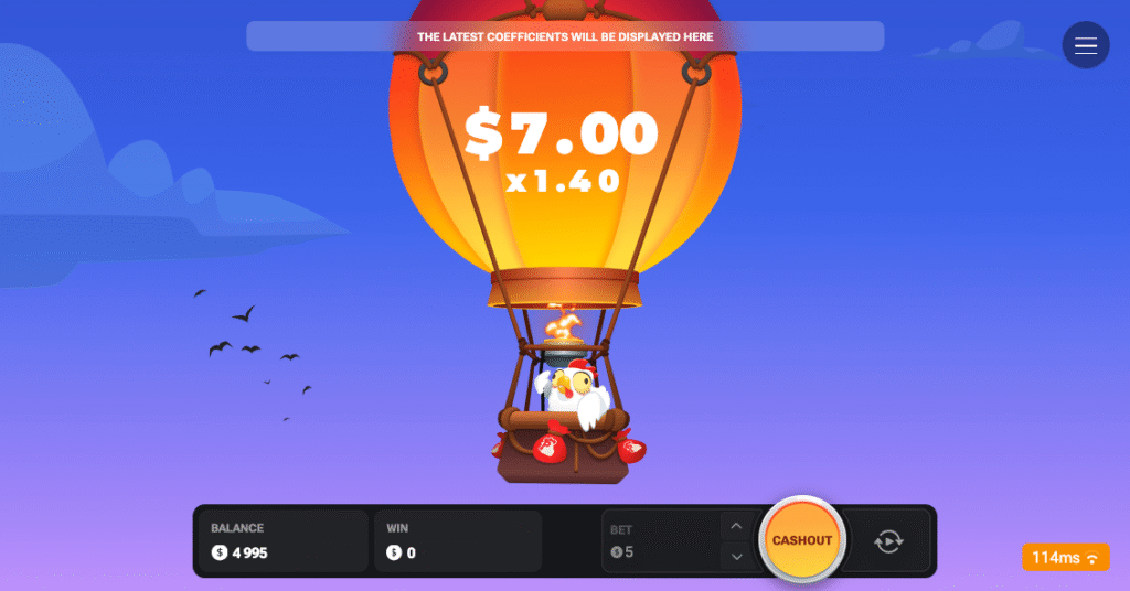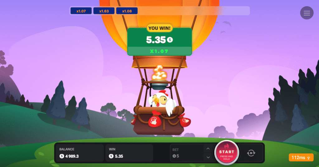 Once your parameters are set, click the red “Start” button to ignite the balloon’s burner and begin ascension. Watch as your chicken companion rises through the sky while the multiplier increases in real-time. The tension builds as you monitor the climbing values, knowing that the balloon could burst at any moment.